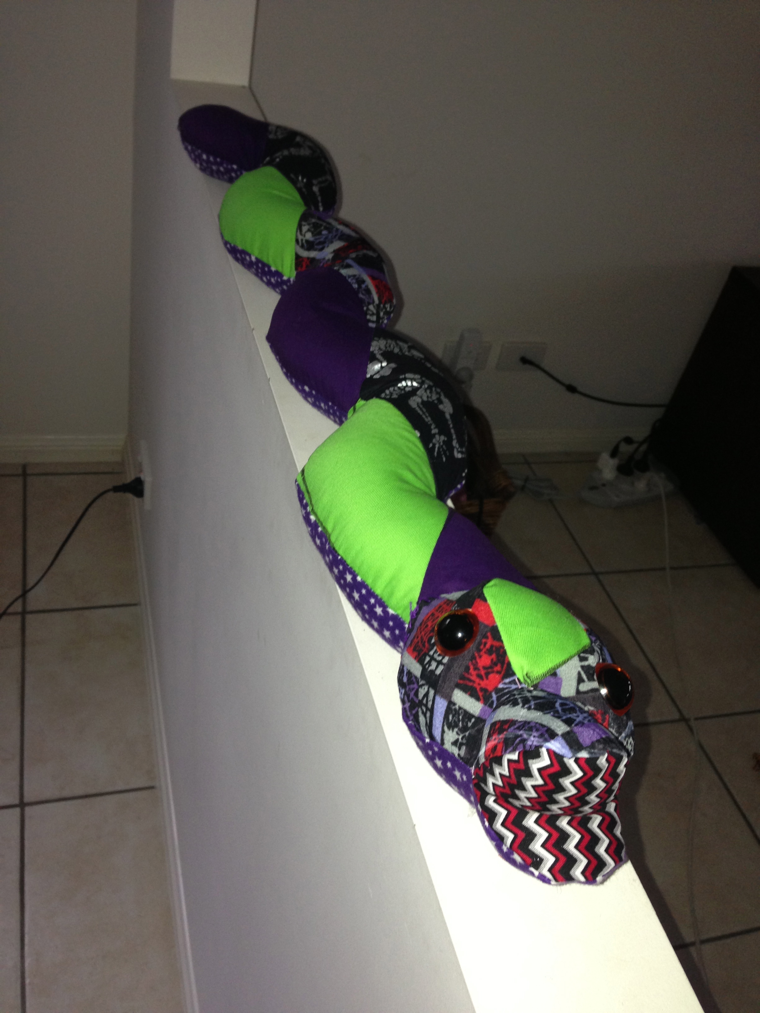 So my scrap material collection is looking quite impressive at the moment, I thought I’d give another softie a whirl. I was ready to make an owl or elephant, but DS talked me into a snake. That sounded easy enough to make with no pattern. We discussed how big he would like it and he picked out the colours (to match the colours in his room).