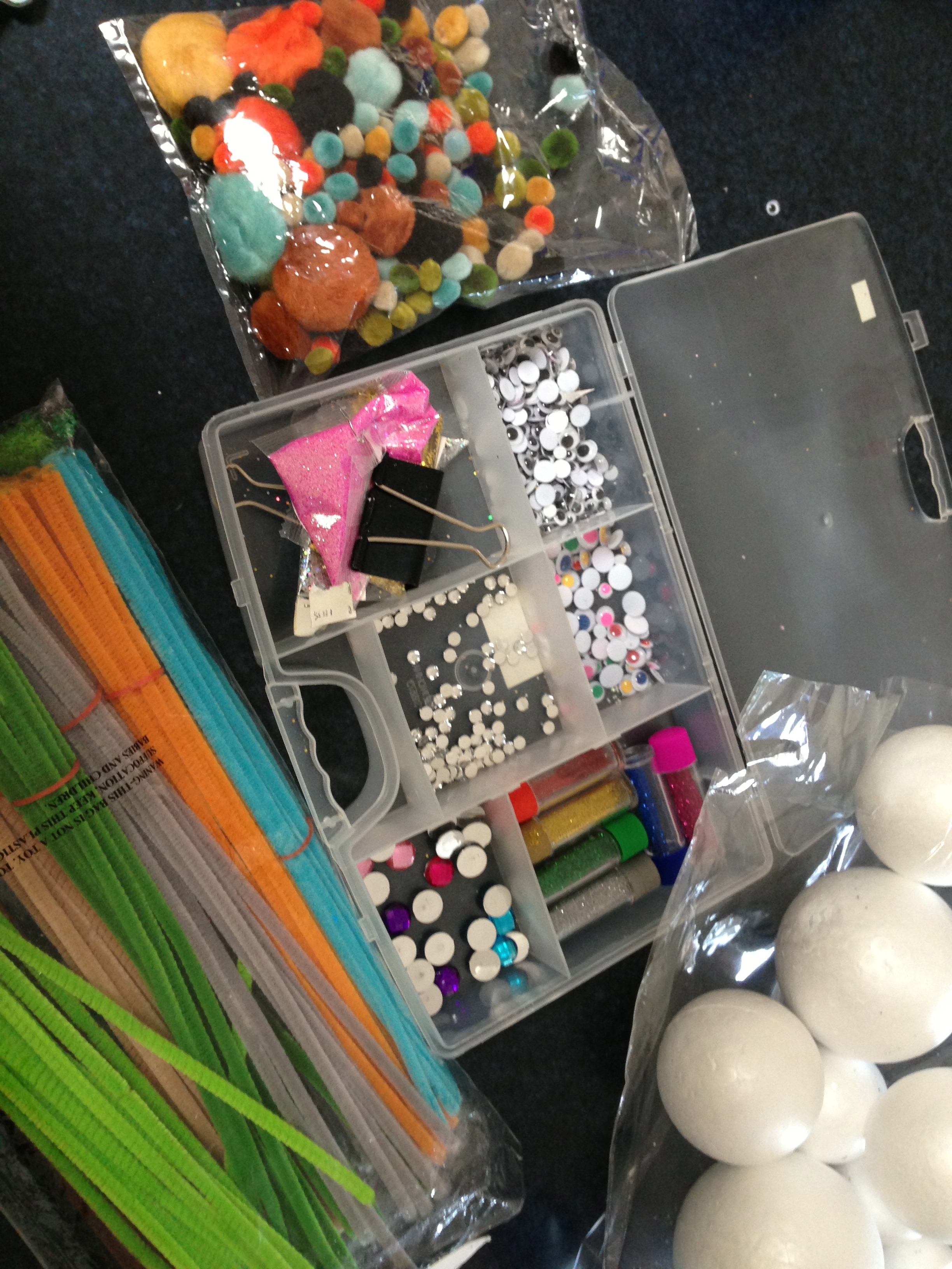- Styrofoam balls, pipe cleaners, boogly googly eyes, pva or craft glue, black felt or card board, dress making pins to secure the wings.