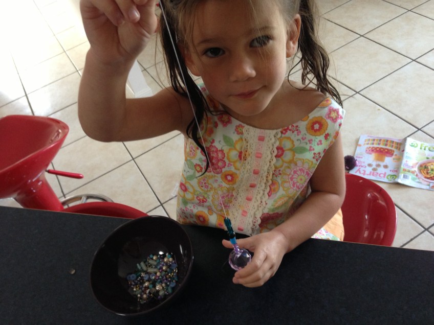 Threading Published October 2, 2012 at 3264 × 2448 in Sun Catchers – School holiday entertainment. Layla demonstrating that is child’s play. She added bells and, crystals and beads. Butterfly beads of course.