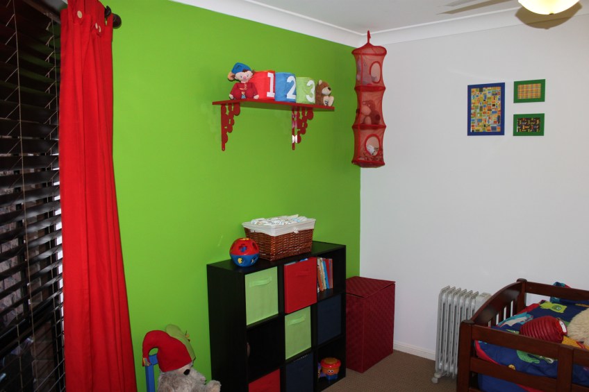 Corner Published October 8, 2012 at 4752 × 3168 in The New house – part 2. Storage cube from Masters Hardware. Shelf, frames, hanging storage and blue chair and number baskets from Ikea. Toy hamper from Overflow.