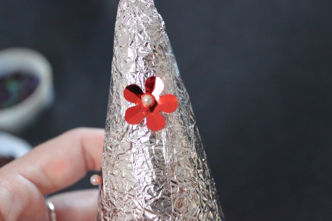 Wrap the foil around the cone and secure with clear tape. I crumpled up a ball of foil before spreading it out on one, to create a more rippled affect. I actually prefer how that one turned out.