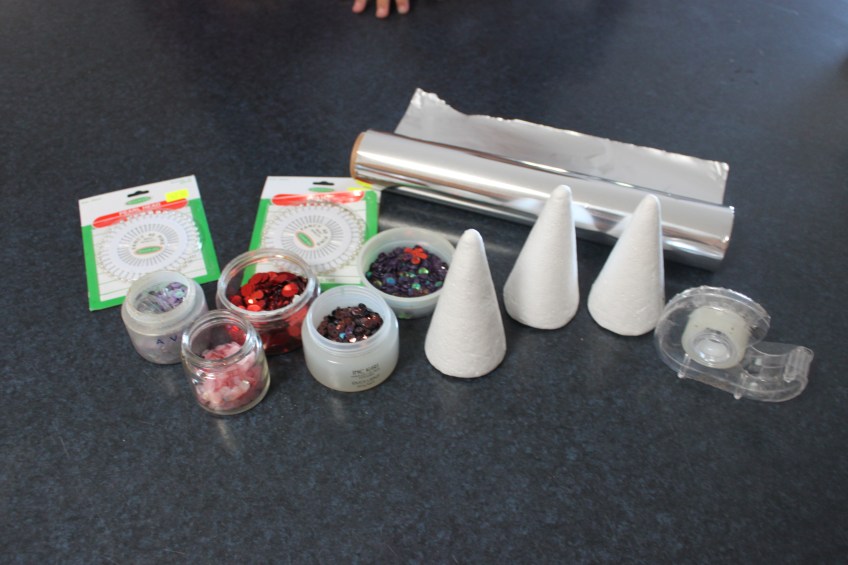 What you need Published November 30, 2012 at 4752 × 3168 in Easy Christmas Craft – Mini Christmas Trees styrofoam tree shapes, sewing pins, aluminium foil, sequins and sticky tape.