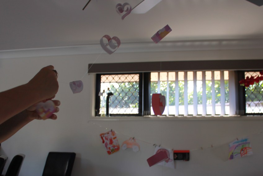 Stringing the hearts on the fishing line Published February 4, 2013 at 3601 × 2420 in Valentine Craft – Hanging hearts Wall/door Decoration Threading the hearts onto the fishing line.