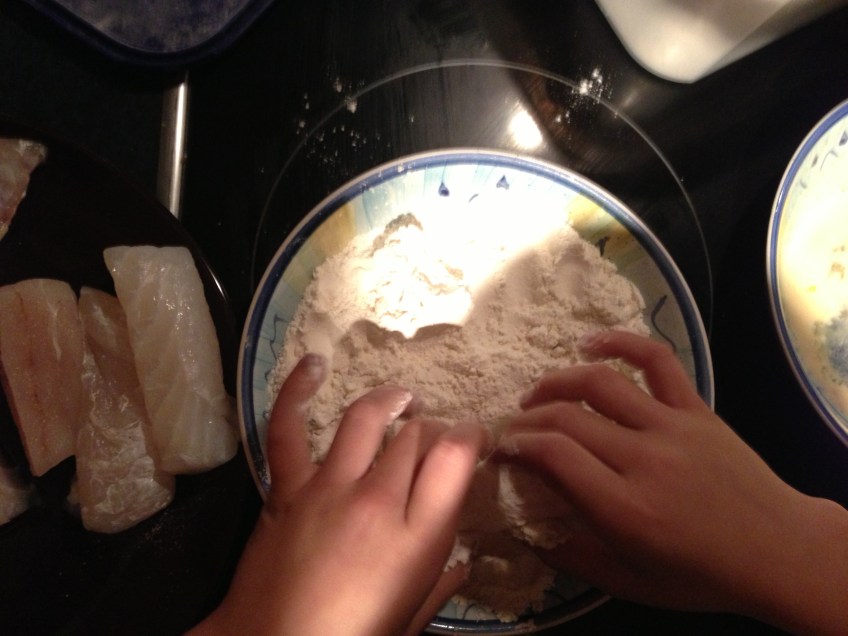 IMG_2581 Published July 27, 2013 at 3264 × 2448 in Kids in the Kitchen, Home Made Fish and Chips. Drying in plain flour,