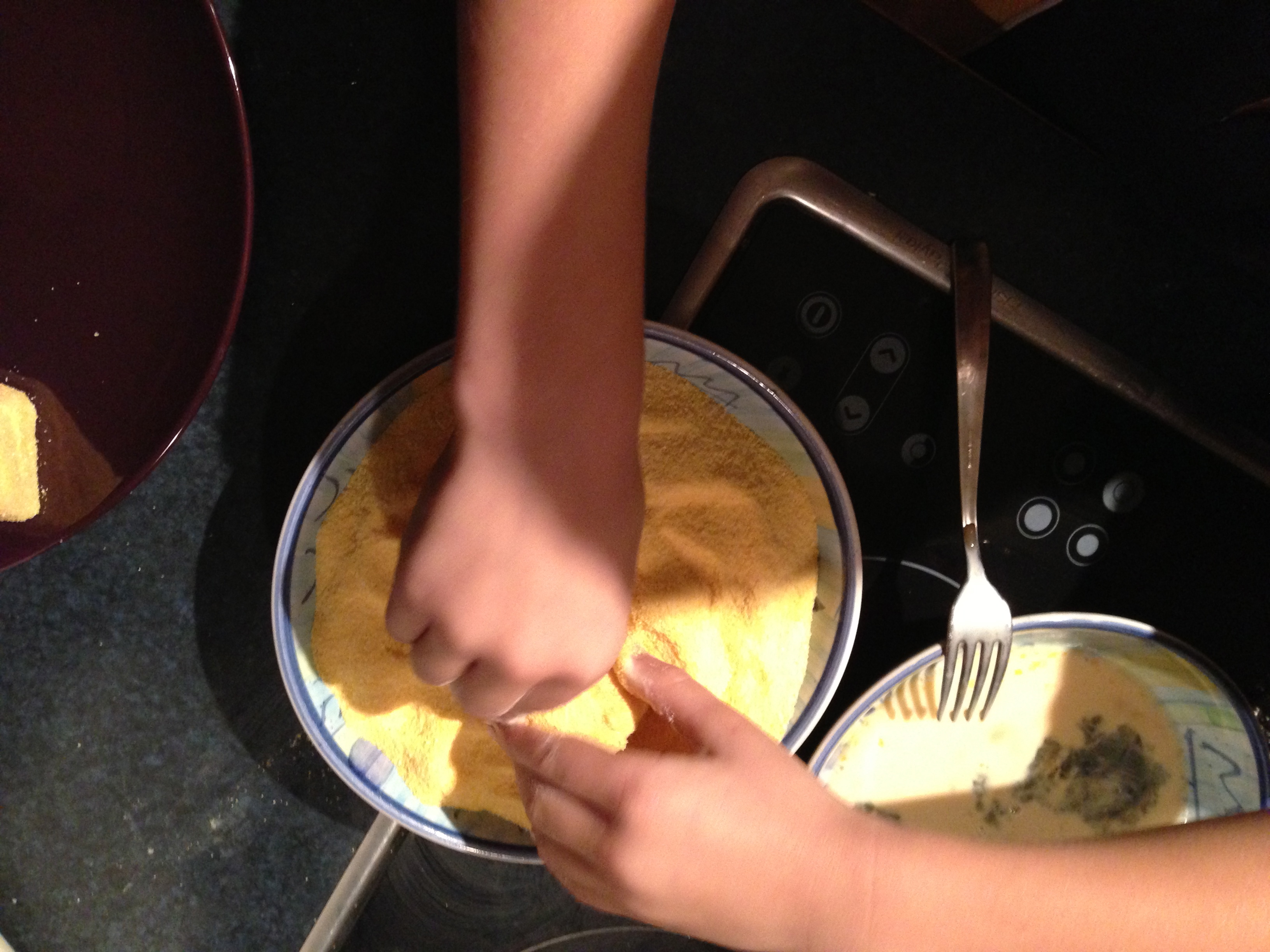 IMG_2585 Published July 27, 2013 at 3264 × 2448 in Kids in the Kitchen, Home Made Fish and Chips. Coating with breadcrumbs