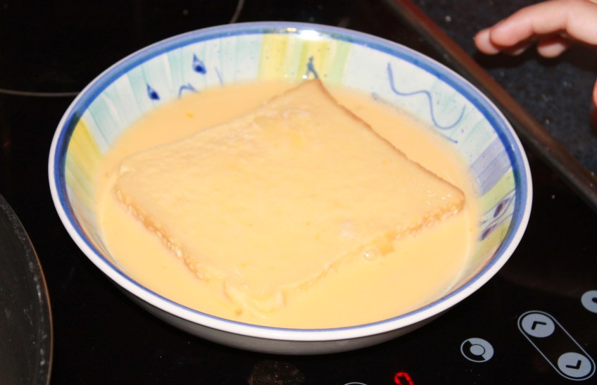 IMG_6719 Published July 28, 2013 at 4039 × 2607 in Kids in the Kitchen, Egg Bread (French Toast) Place one piece of bread at a time in the bowl, turning so you cover both sides