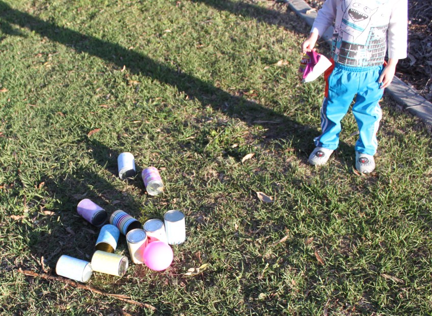 IMG_7031 Published August 20, 2013 at 3235 × 2372 in Ten Tin Bowling! Recycled Cans – Toddler Activity. Gross motor skills