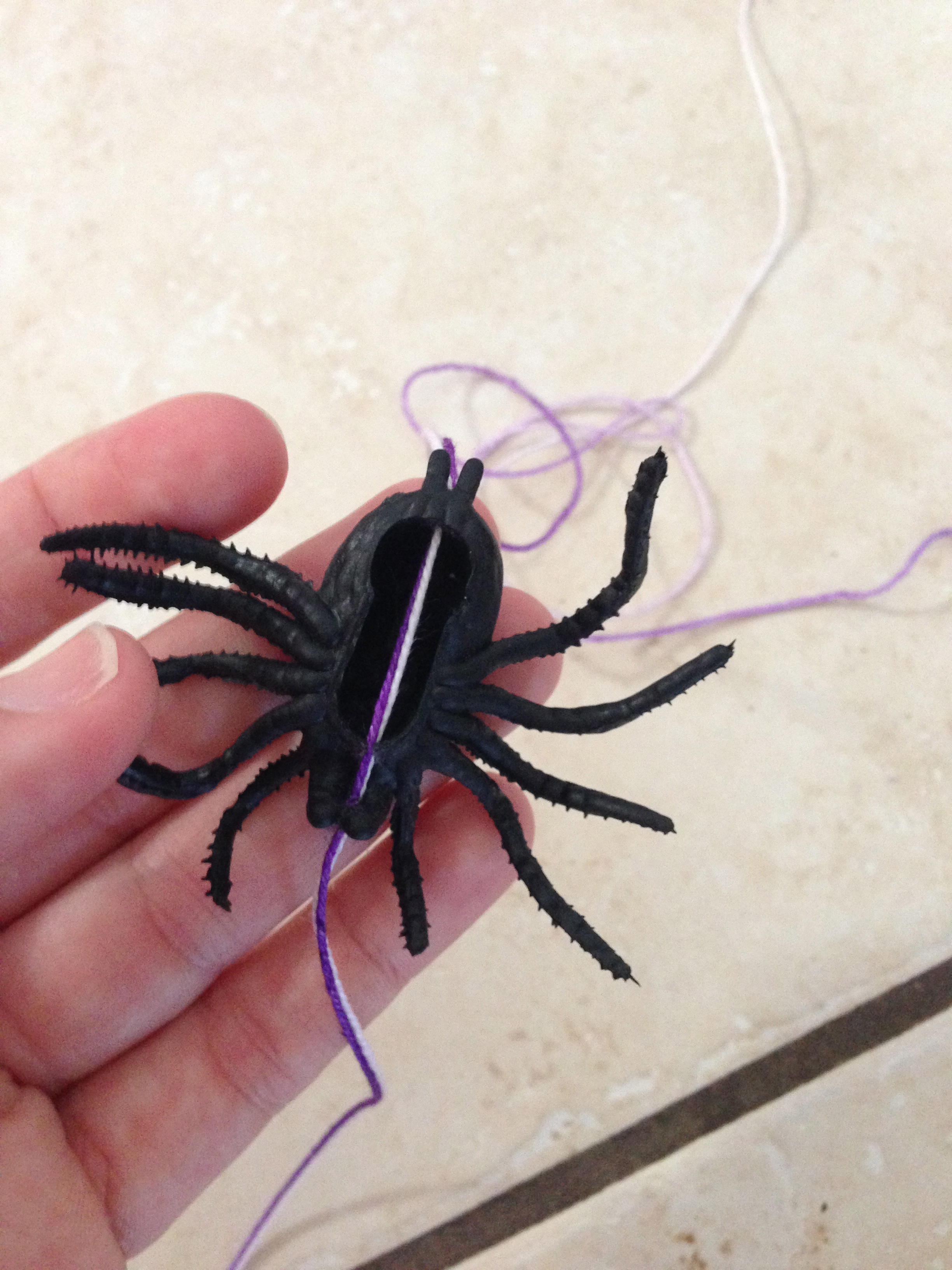 IMG_3537 Published October 6, 2013 at 2448 × 3264 in Spooky Halloween Doorway Hanging. Threading the spiders