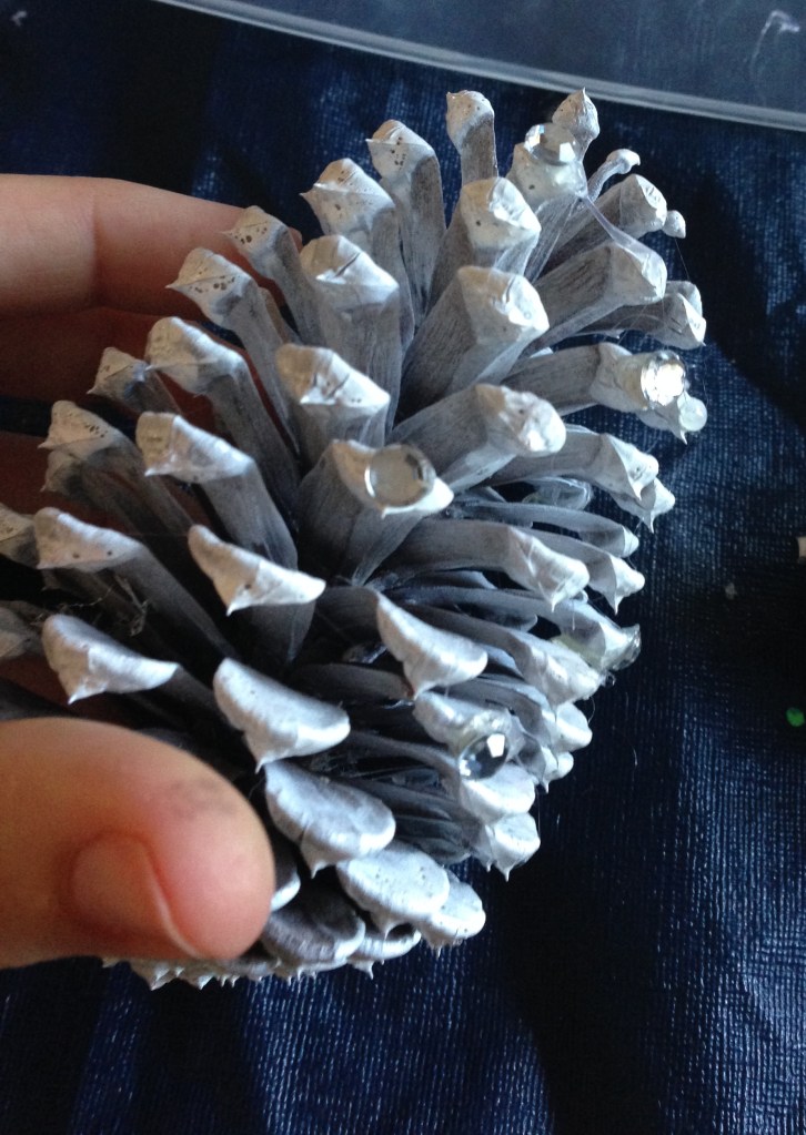 IMG_3709 Published November 15, 2013 at 1850 × 2609 in Pine Cone Christmas Tree Decorations gluing on some bling with hot glue