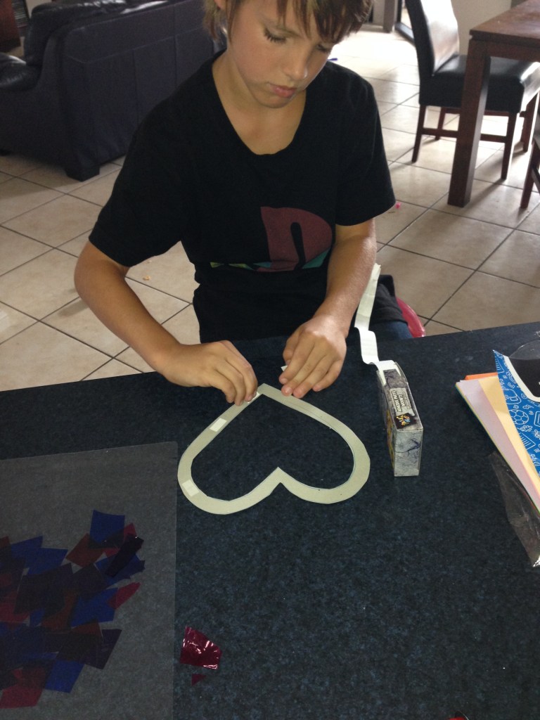 IMG_4557 Published February 2, 2014 at 2448 × 3264 in Kids Valentine Craft – Stained Glass Hearts Mr9 prepared the heart boarder with double sided tape.