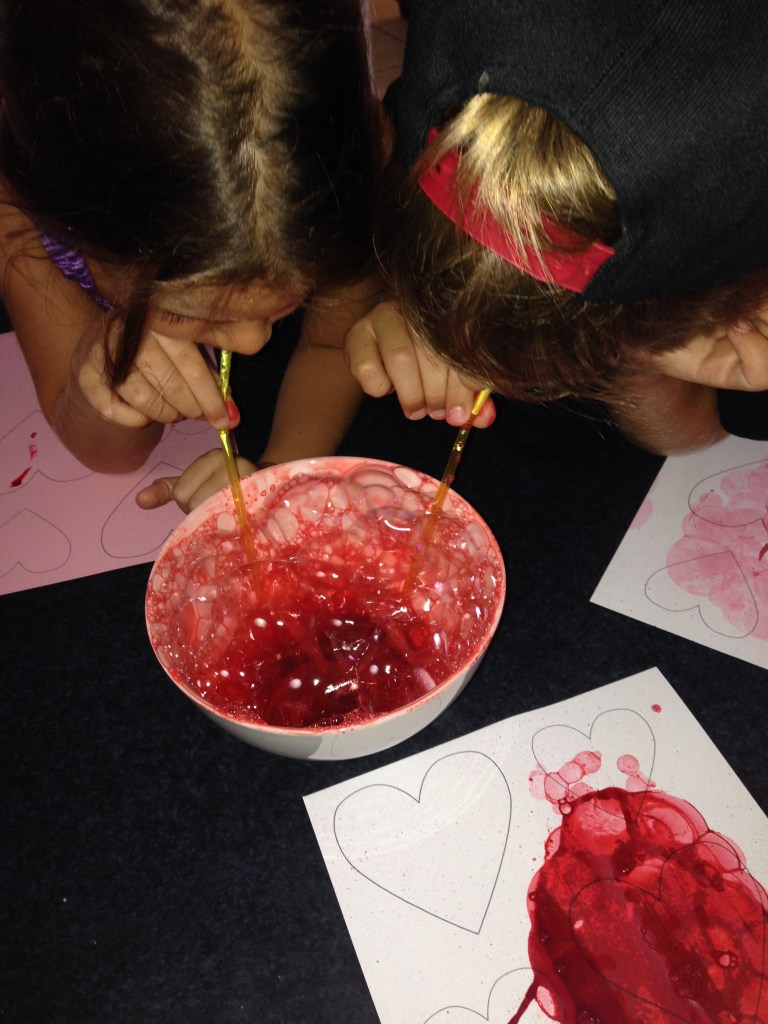 IMG_4569 Published February 2, 2014 at 2448 × 3264 in Kids Valentine Craft, Love Heart Entrance – Bubble Painting. Ms5 and Mr9 blowing bubbles in the solution