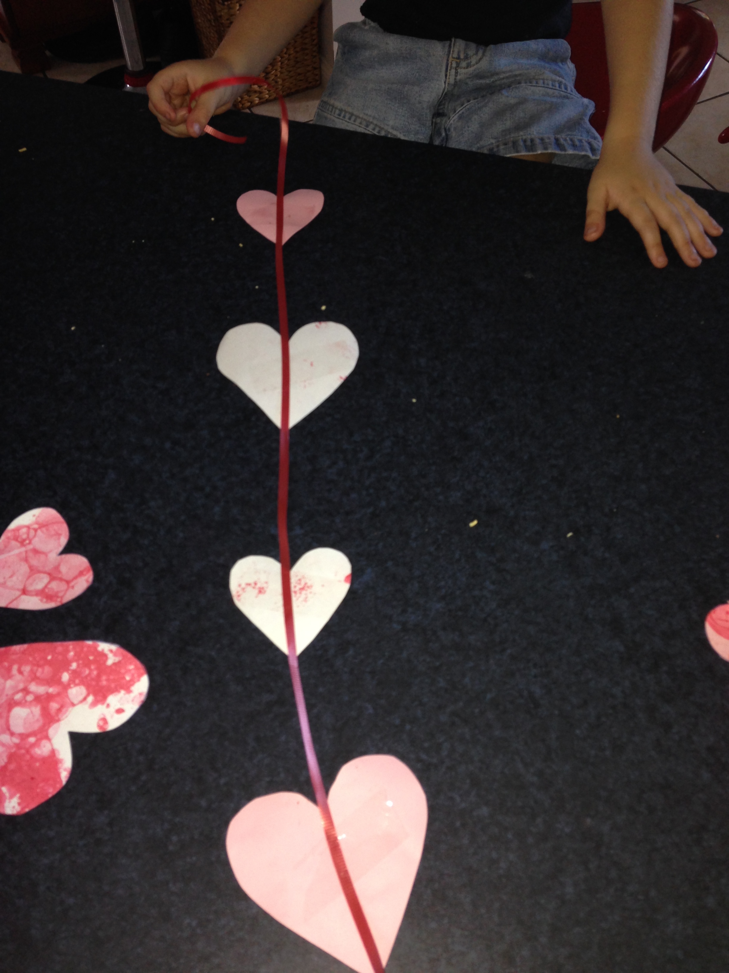 IMG_4573 Published February 2, 2014 at 2448 × 3264 in Kids Valentine Craft, Love Heart Entrance – Bubble Painting. Cut out and attach to some string with tape.