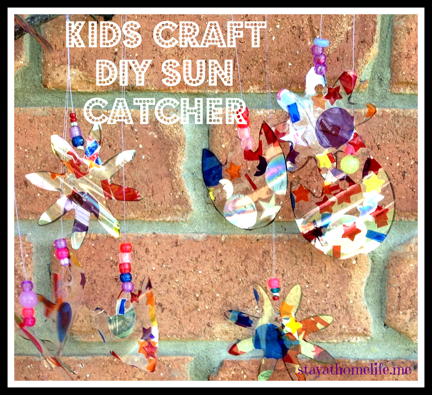 Everyone loves a sun catcher – well according to Pinterest they do! This is basically the same concept as the Valentine Hearts we did a few weeks back, but instead of random shapes, we used a punch to make stars and circles etc from the cellophane. Once laminated, we cut out smaller shapes and hung them from a branch with some beads.