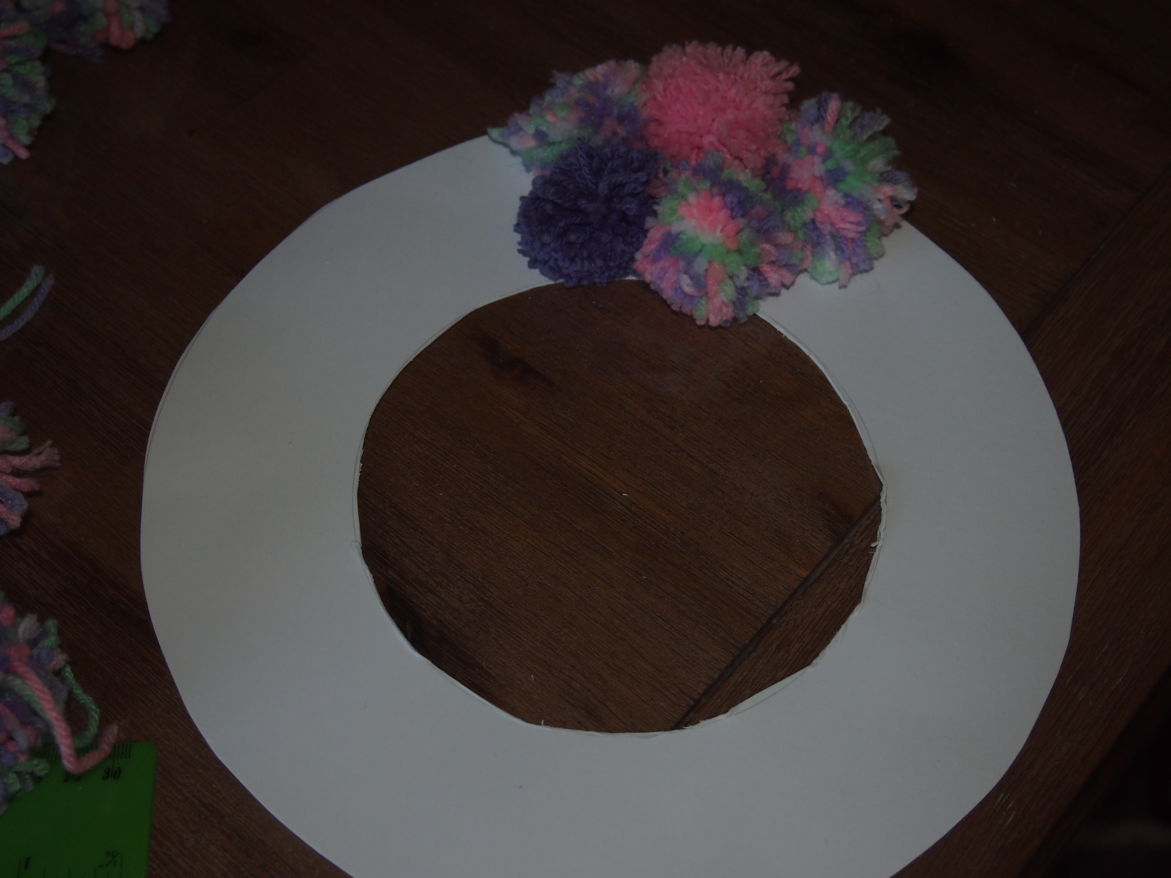 OLYMPUS DIGITAL CAMERA Published March 18, 2014 at 4032 × 3024 in Pom Pom Easter Wreath Attach pom poms using hot glue, as close to gather as possible.
