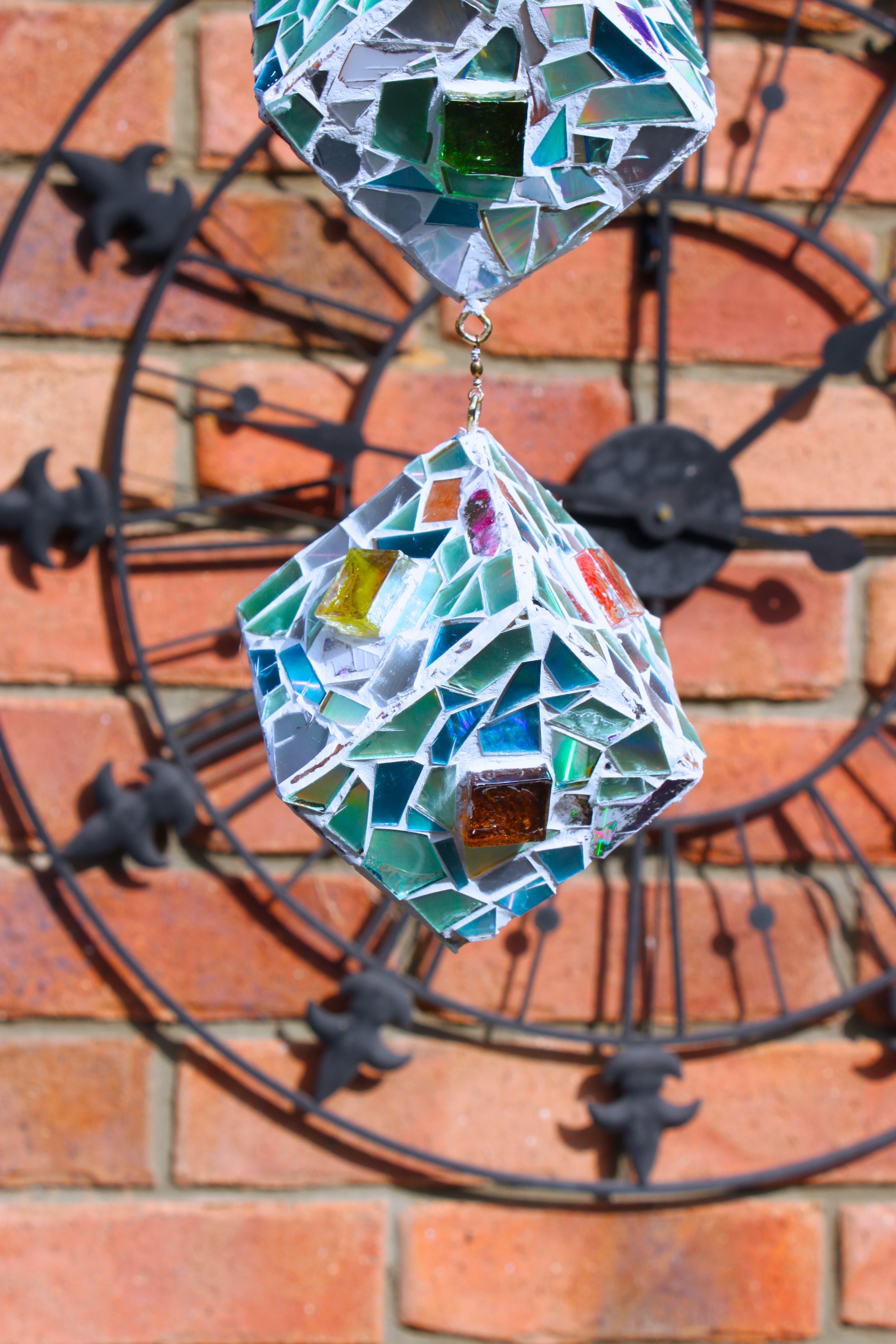 We were having a clean out of old computer stuff and were about to throw away a pile of old discs, but I decided those shinny little things must be good for something else?  So after a bit of thinking, I came up with yet another sun catcher idea.  Anyone would think I like sparkly things?  It took me ages to work out what to cover, a sphere didn’t seem practical as the CD pieces are flat obviously, so after some uhmming and arrring, I decided wooden cubes were the best solution.  The lovely man at the local hardware was kind enough to give me some 3″ x 3″ off cuts for free.  The rest of the instructions are on the pictures.  I just used clear drying craft glue to attach the CD chips to the wood and the grout is standard bathroom tile grout mixed according to instructions, available from any hardware (we had some left over from the laundry renovation).
